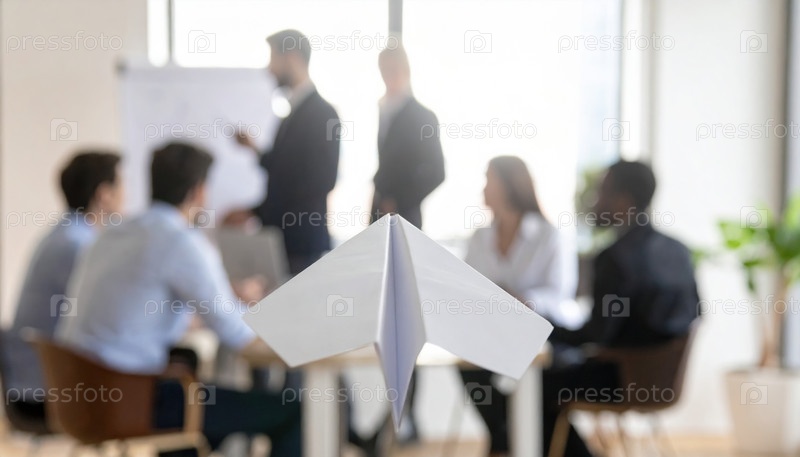 Бумажный самолет, летящий перед деловой встречей, символизирующий креативность, инновации и мышление роста стартапов в профессиональной командной работе и среде разработки идей