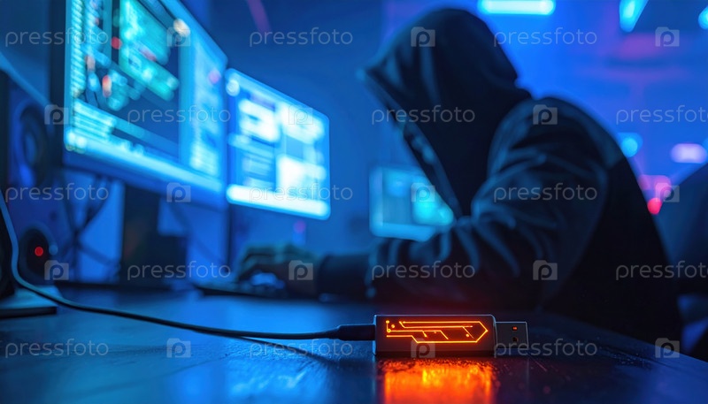 Хакер в темной комнате печатает на клавиатуре с светящимся USB-устройством в фокусе, представляя киберпреступность, взлом и нарушения цифровой безопасности в сегодняшней среде неоновых технологий