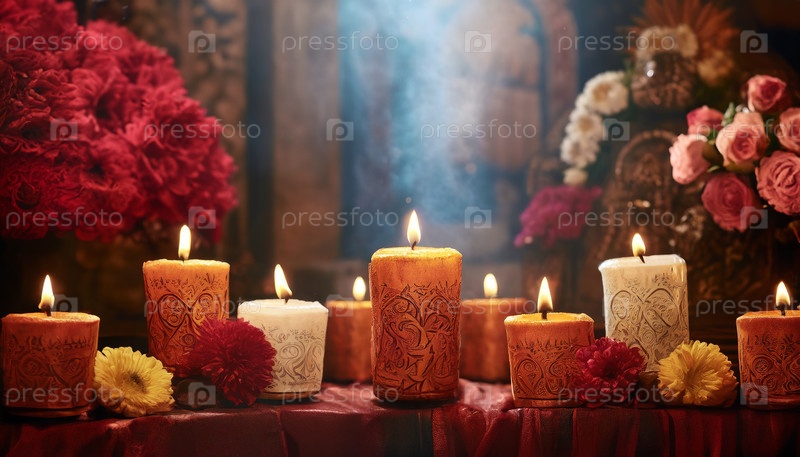 Светящиеся ритуальные свечи, окруженные цветами, символизируют память, духовность, культурное наследие и вечную традицию почитания жизни и памяти в священных местах