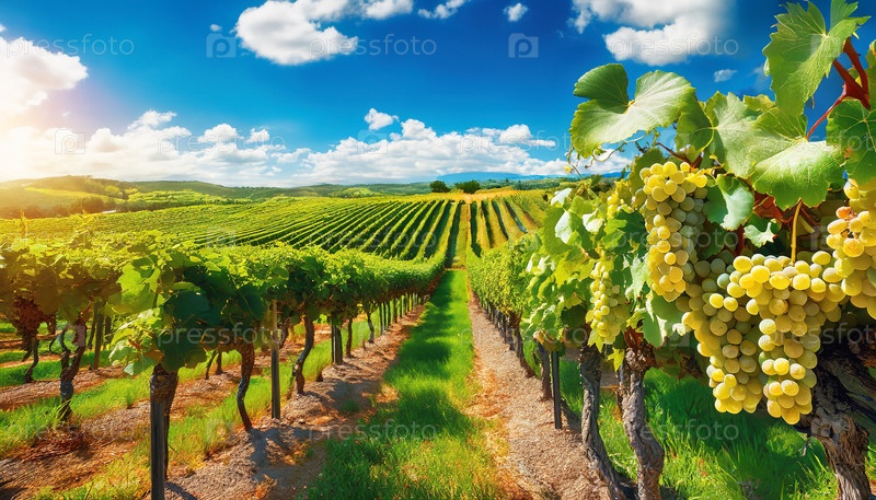 Виноградник простирается под солнечным небом со зрелыми гроздьями, символизирующими сезон сбора урожая, традиции, сельскохозяйственное наследие, праздники и вечную красоту винодельческих регионов