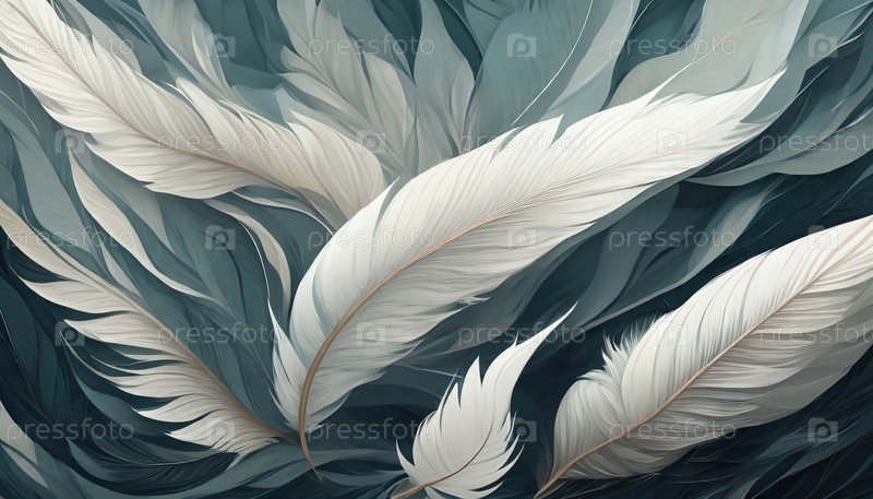 Абстрактная композиция из нежных белых перьев на темном фоне, вызывающая чистоту, мягкость, мечты, свободу и легкость в сюрреалистическом художественном видении