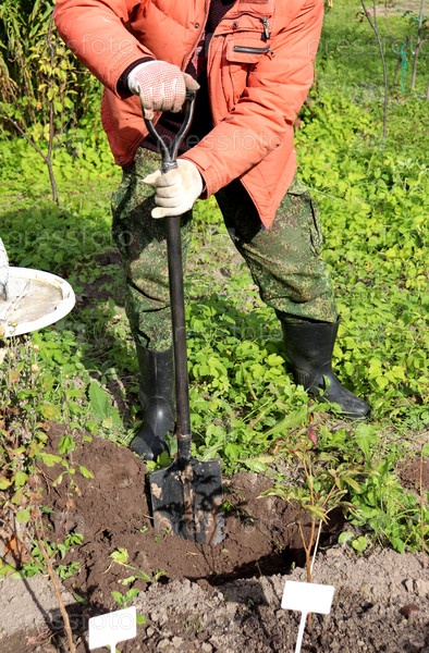 Фермер-пенсионер, опираясь на лопату, копает яму для посадки цветов в клумбе своего сада в солнечный осенний день