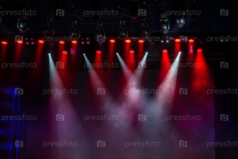 Пустая театральная сцена, освещенная красным светом и несколькими прожекторами.Сцена создает ожидание спектакля или события в большом аудитории