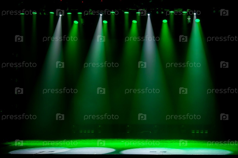 Пустая театральная сцена, освещенная зеленым светом и несколькими прожекторами.Сцена создает ожидание спектакля или события в большом аудитории