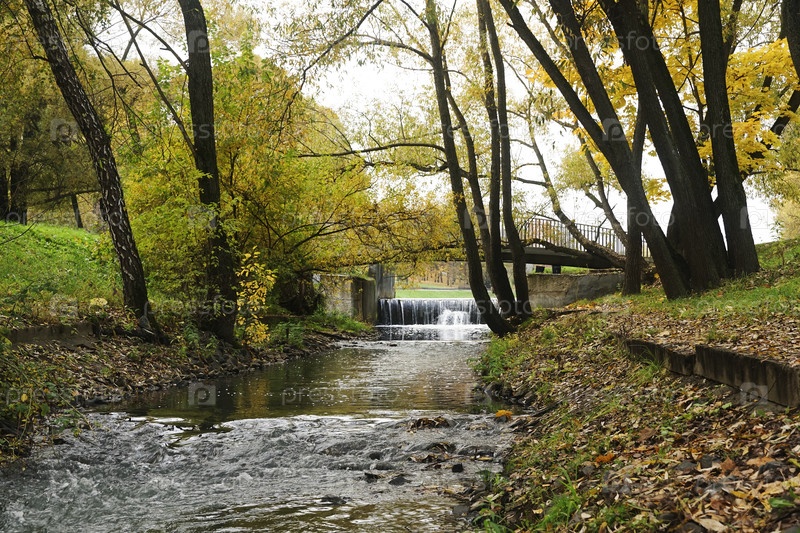 Река Бица с водопадом и мостом в осеннем парке Северного Бутова, Москва