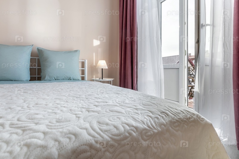 Яркий интерьер спальни с синими подушками и свежими полотенцами на кровати