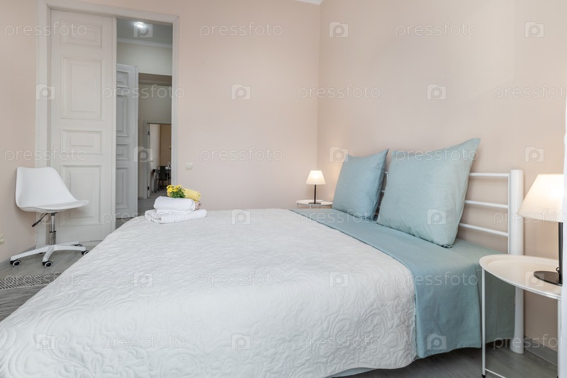 Современный интерьер спальни с синей кроватью и белым стулом