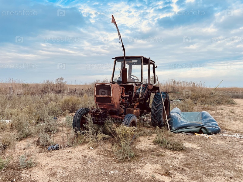 Старый, ржавый трактор стоит на поле с сухой травой