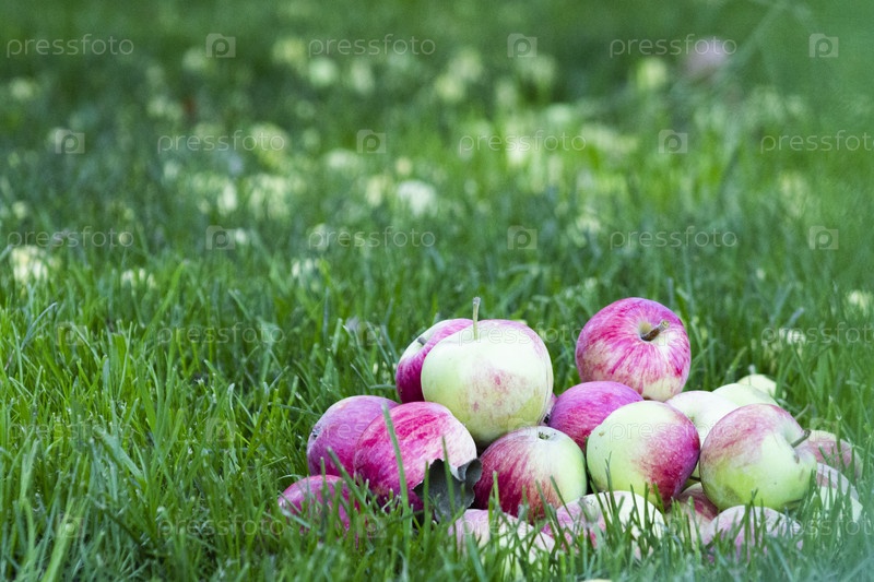 Осенние натюрморты, спелые яблоки в траве, урожай фруктов