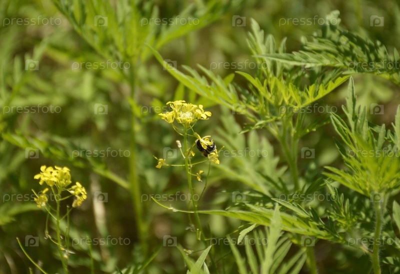 Маленький желтый полевой цветок с пчелой, сидевшей на нем и собирающей нектар.Фото иллюстрирует спокойствие летнего дня и красоту природы в деталях