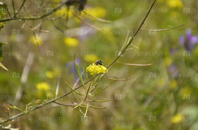 Маленький желтый полевой цветок с пчелой, сидевшей на нем и собирающей нектар.Фото иллюстрирует спокойствие летнего дня и красоту природы в деталях