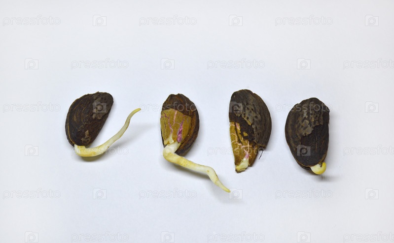 Прорастающие семена миндаля с крошечными побегами на белом фоне. Четыре миндаля, из которых выросли будущие деревья. Озеленение планеты и забота об окружающей среде