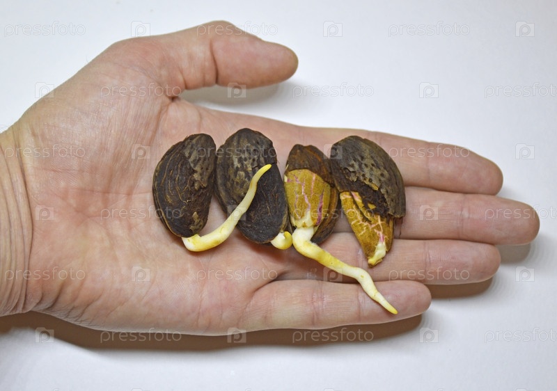 Четыре прорастающие семена миндаля с небольшими побегами в руке человека на белом фоне Концепция озеленения планеты и ухода за растениями Выращивание декоративных растений дома
