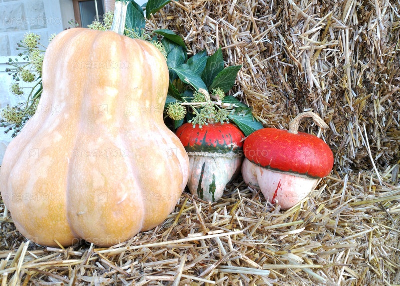 Осеннее расположение спелых тыквен на шариках соломы. большая светло-оранжевая тыква и две декоративные тыки, напоминающие грибы. настроение осени
