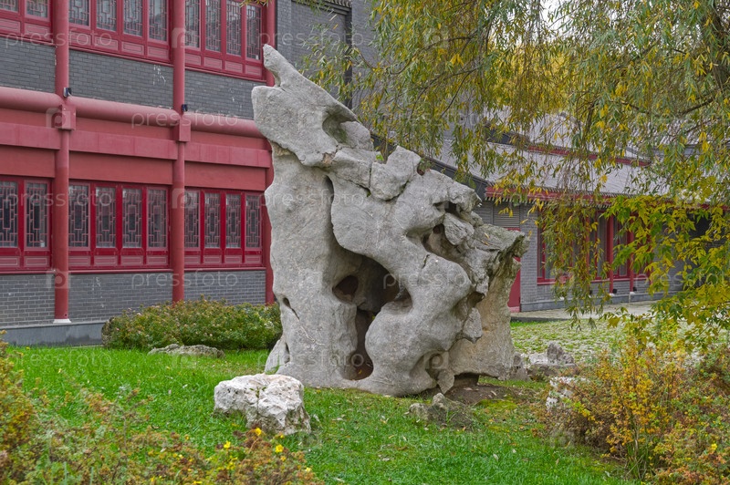 Камень странной формы в китайском парке Хуамин, Москва, Россия.Облачный день середины октября