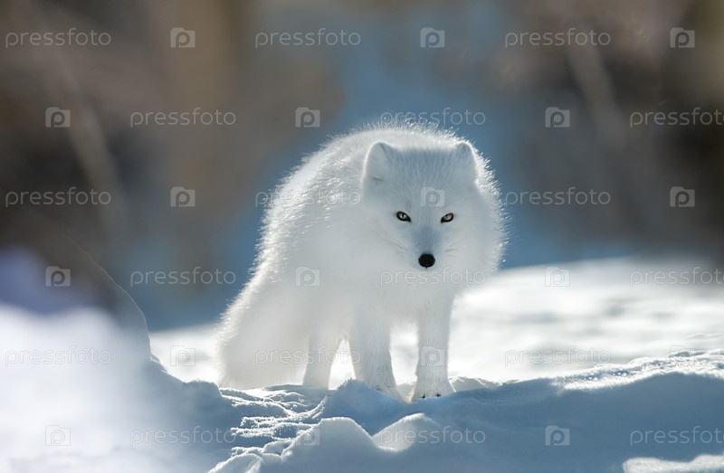 Полярная лиса (Vulpes lagopus) с белым мехом стоит на снегу в яркой зимней среде, создавая спокойную и холодную атмосферу