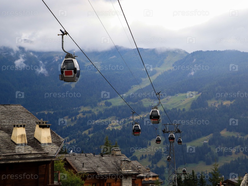 Движение канатной дороги останавливается на фоне гор