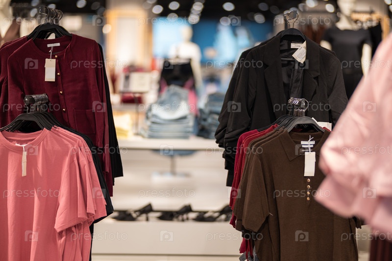 Различные предметы одежды, включая куртки и рубашки, висят на стеллажах в хорошо освещенном магазине одежды, демонстрируя современную модную розничную торговлю и опыт покупок