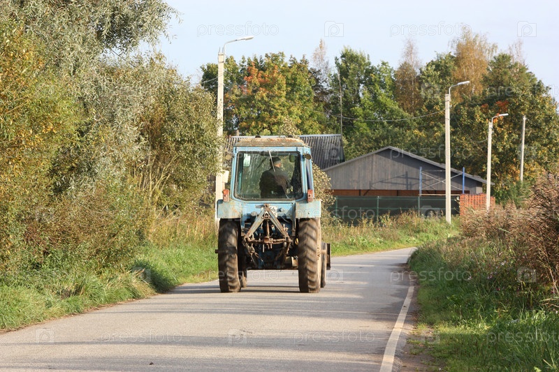 Трактор находится на асфальтированной дороге.Ленинградская область, Гатчинский район