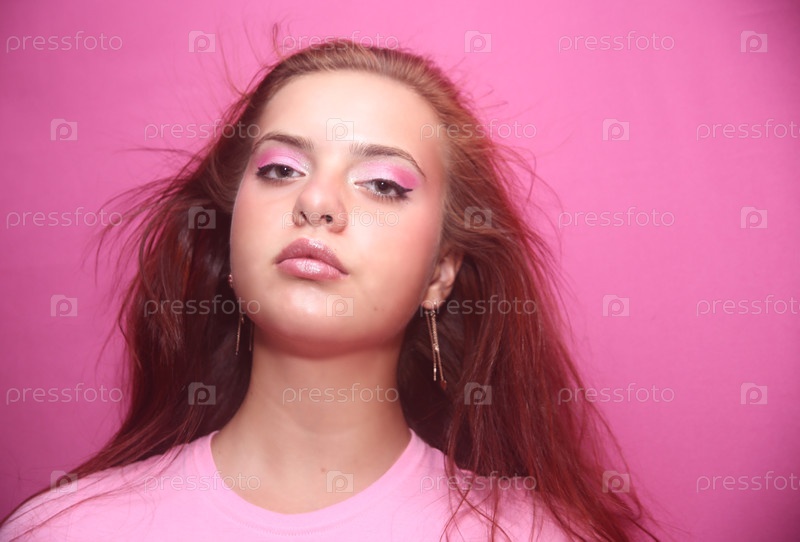 Красивая девушка позирует на розовом фоне