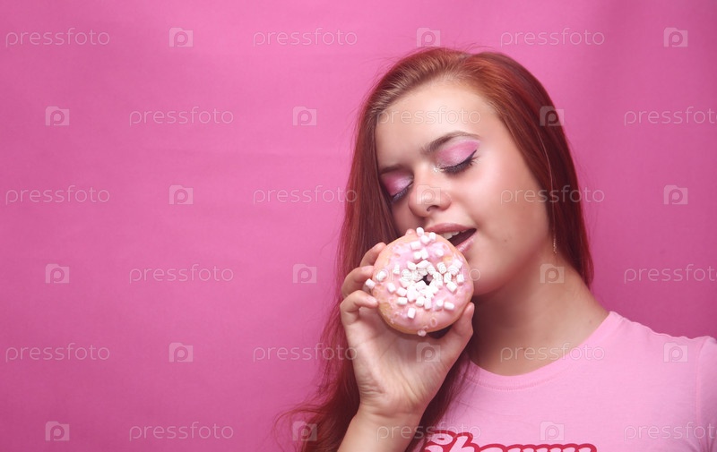 Красивая девушка позирует на розовом фоне с пончиком