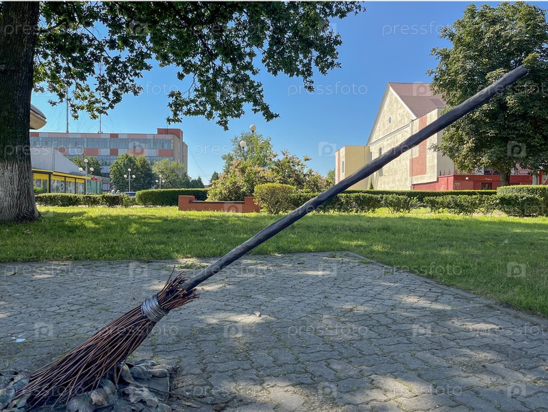Скульптура метлы Бабы Яги находится на Злобинской площади, Беларусь