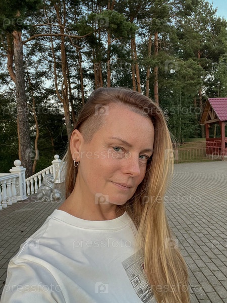 Зрелая женщина с длинными светлыми волосами отдыхает в природе