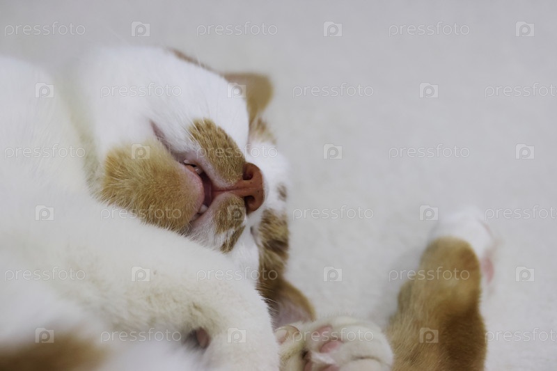 Красно-белый кот, спящий, свернутый на бок