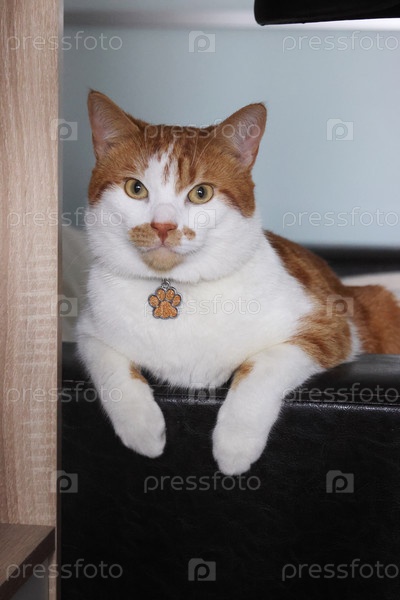 Имбирно-белый кот сидит на подлокотнике стула, вися передними лапами