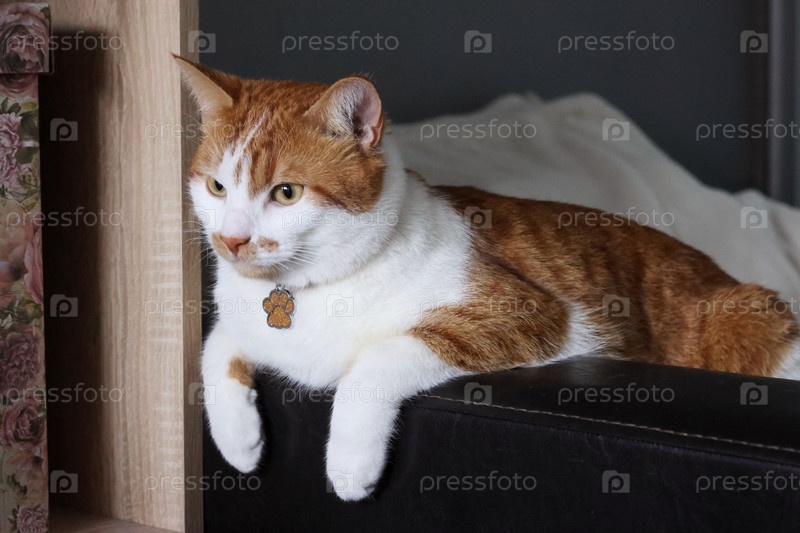 Имбирно-белый кот сидит на подлокотнике стула, вися передними лапами
