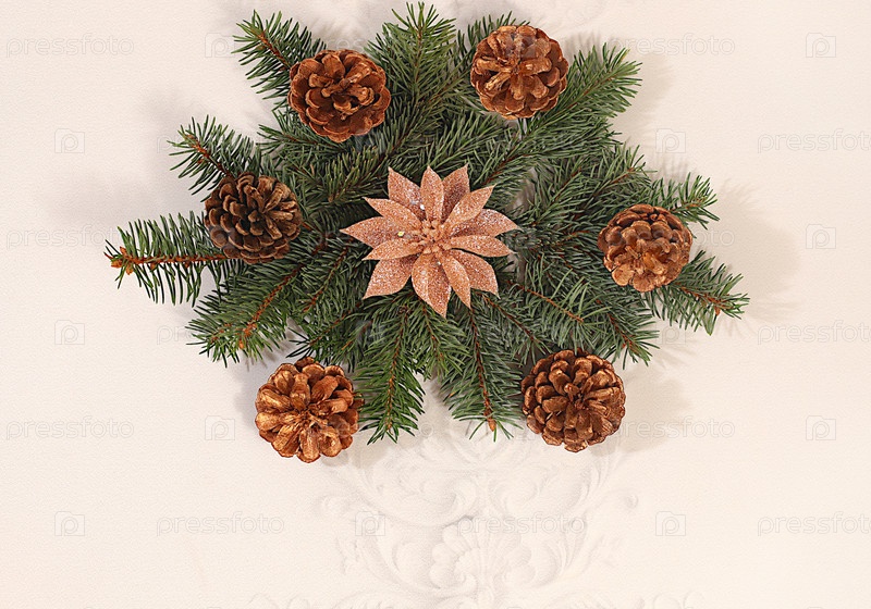 Красивое праздничное украшение живых ветвей и конусов сосны, изолированных на ярком фоне, рождественский шаблон для дизайна, рождественская композиция и концепция New 2026, баннер для зимы