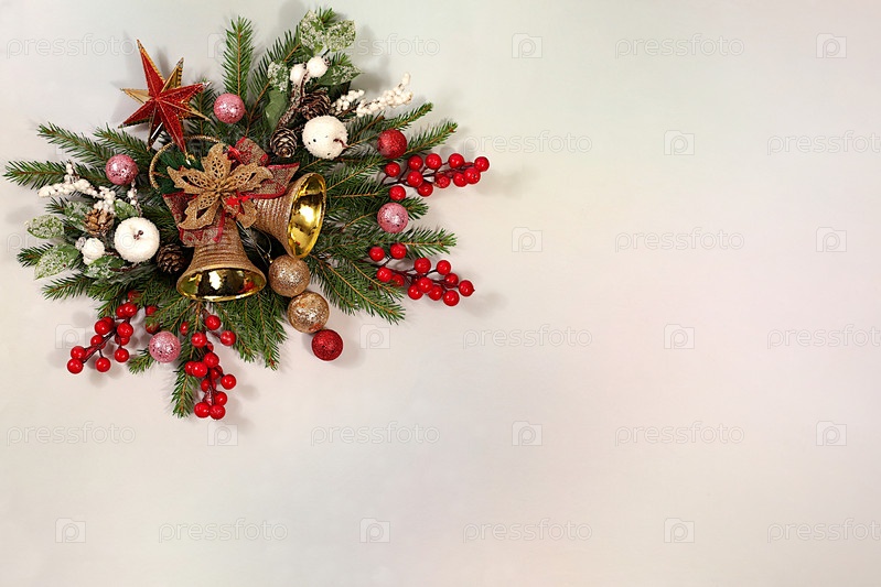 Красивое праздничное украшение из живых веток и игрушек пихты, колокола, звезды, изолированные на ярком фоне, рождественский шаблон для дизайна, Рождественская композиция и концепция New 2026, баннер