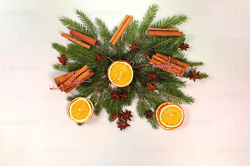 Красивое праздничное украшение из живых ветвей елей, корицы, сушеных апельсинов, звездного аниса на ярком фоне, рождественский шаблон для дизайна, рождественская композиция и Новый год 2026