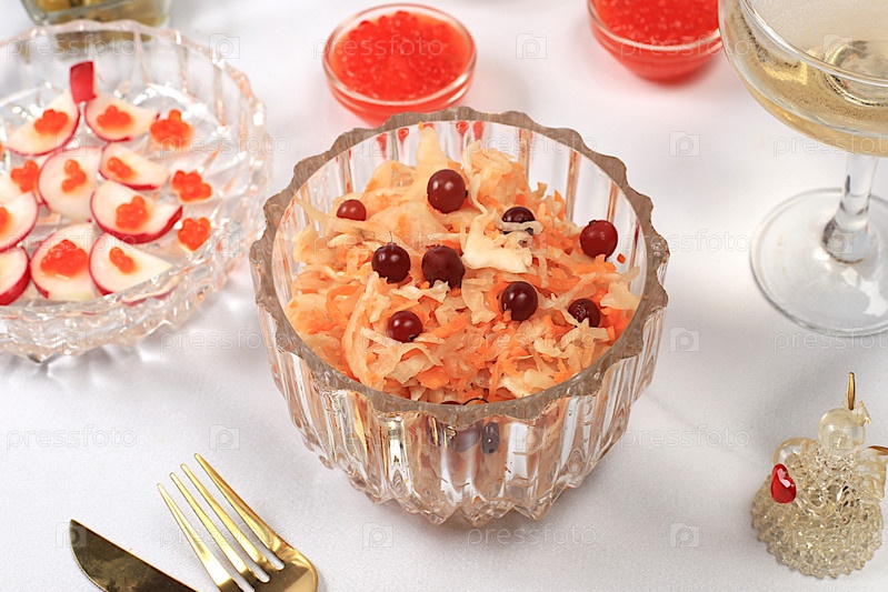 Праздничные рождественские и новогодние блюда на элегантном столе. вегетарианская закуска из уксусной капусты с клюквой, редиской, огурцом, яйце-оливковым салатом, красным хайваром и бокалами для шампанского