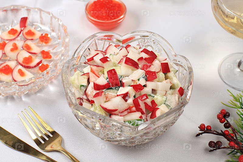 Рождественские и новогодние блюда, концепция детоксикации, традиционный овощной салат с огурцами, помидорами и редисами, идеи рецептов на праздник, здоровый образ жизни и концепция здорового питания
