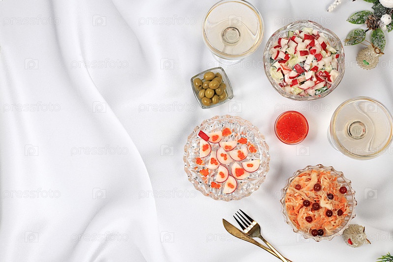 Праздничные рождественские и новогодние блюда на элегантном столе. вегетарианская закуска из уксусной капусты с клюквой, редиской, огурцом, яйце-оливковым салатом, красным хайваром и бокалами для шампанского