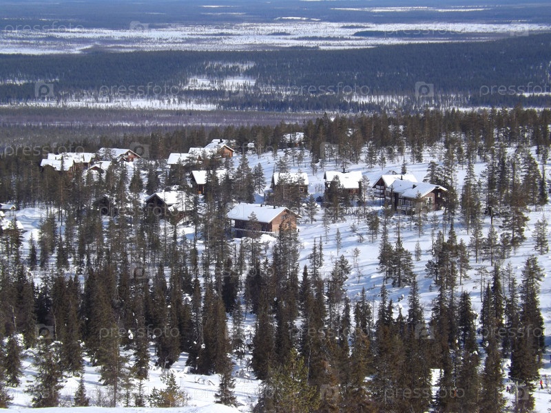 Вид на коттеджи с горы Леви. За полярным кругом. Финляндия