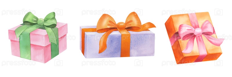 Набор подарочных коробок с шелковыми лентами. Иллюстрация акварели. Для ткани, обоев, упаковочной бумаги, поздравительных открыток, дизайна, декора и иллюстрации
