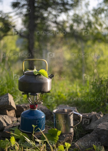 Летний натюрморт, кипящий чайник на газовом горелке и кружка с горячим чаем на фоне леса