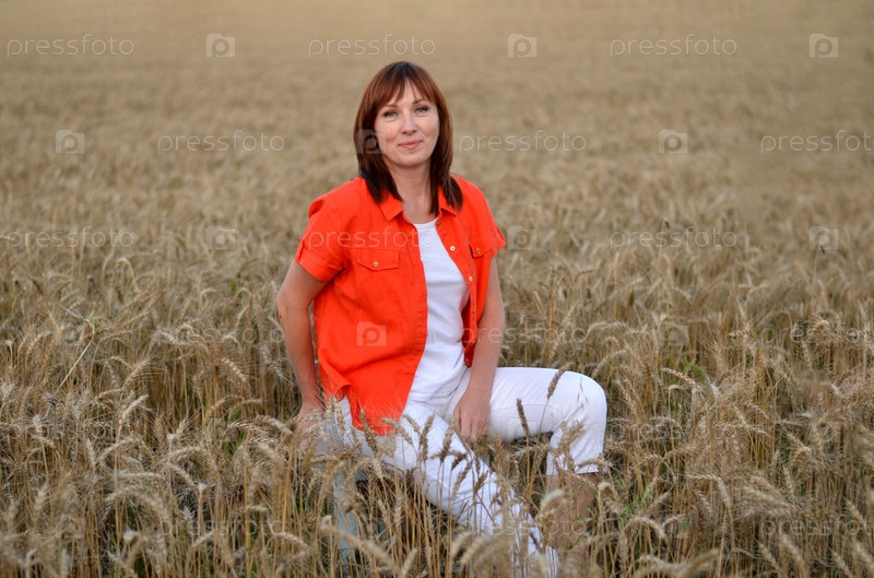 Женщина, сидящая на поле золотой пшеницы во время заката солнца, захватила спокойный момент связи с природой под теплым светом