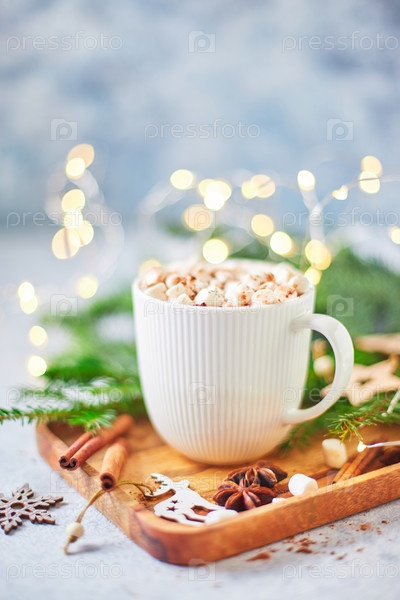 Чашка горячего какао с зефирами и конфетами на деревянном столе с рождественской елкой и светящейся гирляндой в Рождество