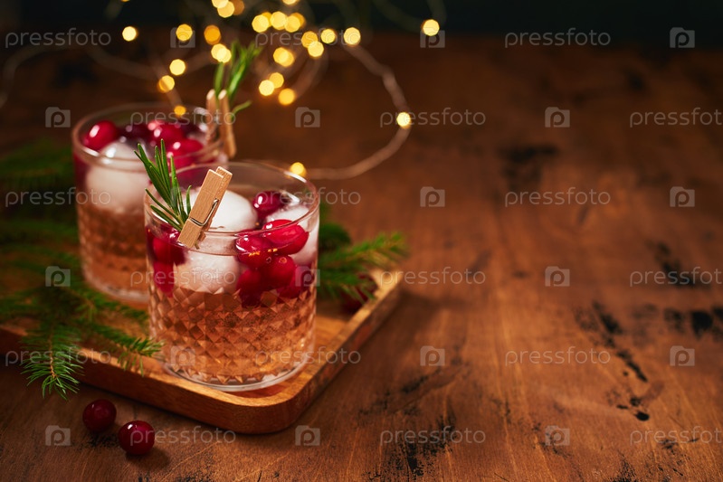 Коктейль с алкоголем или безалкогольный коктейль с водкой и клюквенной ягодой со льдом, ветвями пихты и светящейся гирляндой на Рождество на деревянном фоне