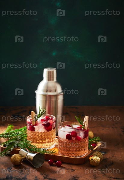 Алкогольный коктейль или безалкогольный коктейль с водкой и клюквой со льдом, шейкером, джиггером и ложкой, ветвями пихты и светящейся гирляндой на Рождество на деревянном фоне