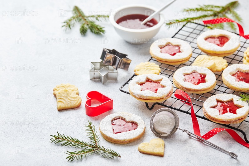 Классические рождественские печенье Linzer с малиной или клубничным вареньем на светлом фоне