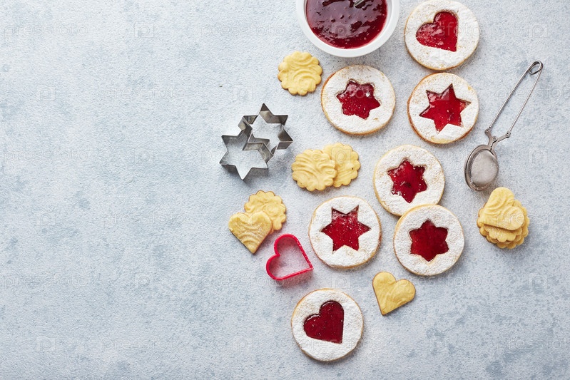 Классические рождественские печенье Linzer с малиной или клубничным вареньем на светлом фоне. текстовое пространство. вид сверху