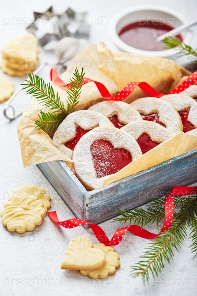 Классические рождественские печенье Linzer с малиной или клубничным вареньем в деревянном ящике на светлом фоне