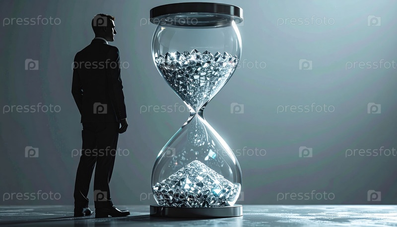 Бизнесмен стоит рядом с гигантскими песочными часами, наполненными бриллиантами, представляющими терпение и инвестиции, символизирующие корпоративную стратегию и концепцию жизненных приоритетов