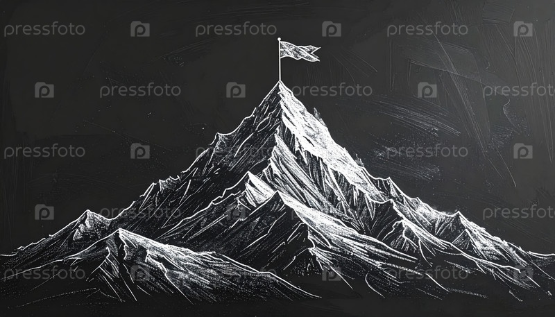 Минималистский чертеж мелом горной вершины с флагом, символизирующим достижения, успех, лидерство и новые горизонты в абстрактном мотивационном стиле