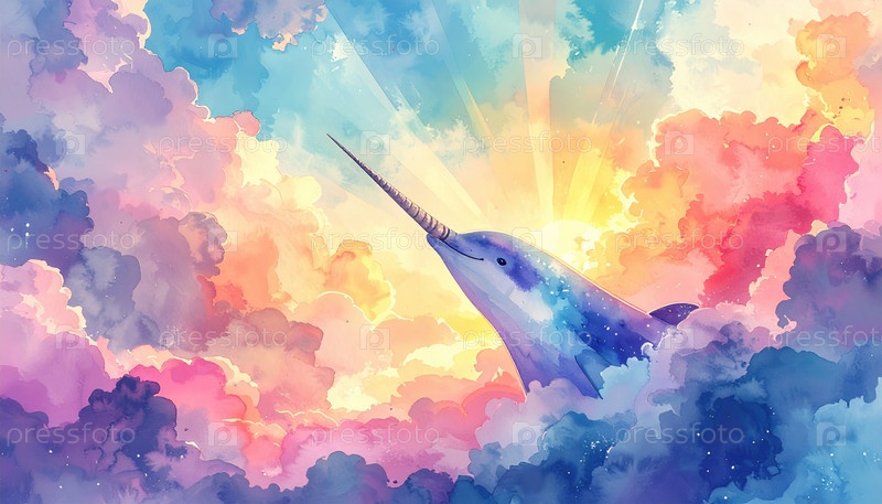 Сонный нарвал плавает среди красочных облаков на рассвете, представляя воображение, позитивность и безграничное творчество, часто ассоциируемое с темами фантазии и искусства