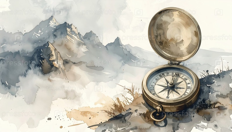Винтажный компас, опирающийся на скалистую местность с туманными горными вершинами на заднем плане, символ исследования, путешествий, приключений и направления в жизненном пути